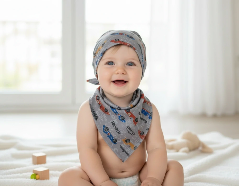 jemný bavlněný šátek má mnoho použití, možné použít jako klasický šáteček na zavazování pod bradičkou, nebo vzadu či jako pirátský, může sloužit i jako slintáček, také jako lehká šálka ochrání krček miminka před chladem.