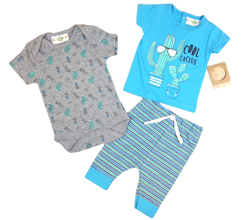 soupravička obsahuje body s krátkým rukávem s obrázky, tričko s krátkým rukávke obrázkem a nápisem COOL CACTUS, pruhované tepláčky s pohodlným pružným pasem, nohavičky ukončené pružným úpletem.