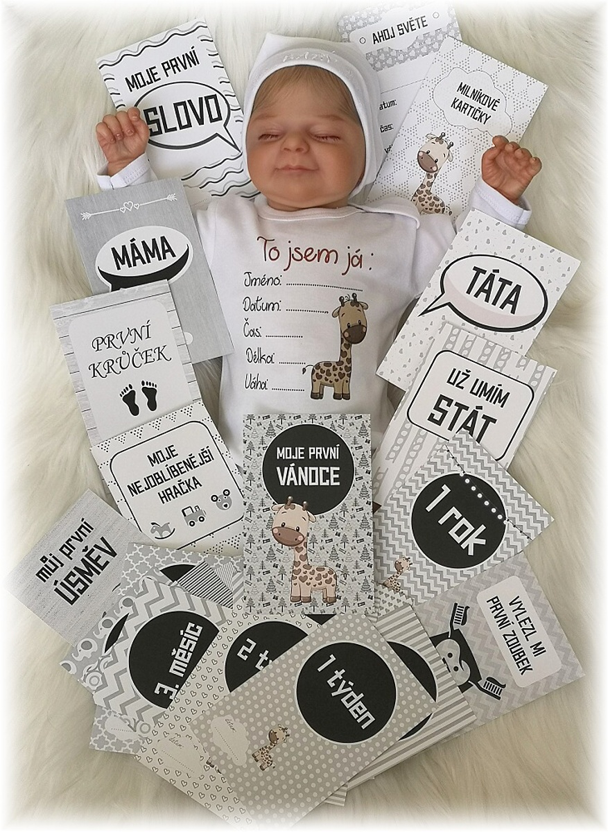 1x milníkové kartičky - perfektní pomůcka k zachycení nejdůležitějších okamžiků miminka.