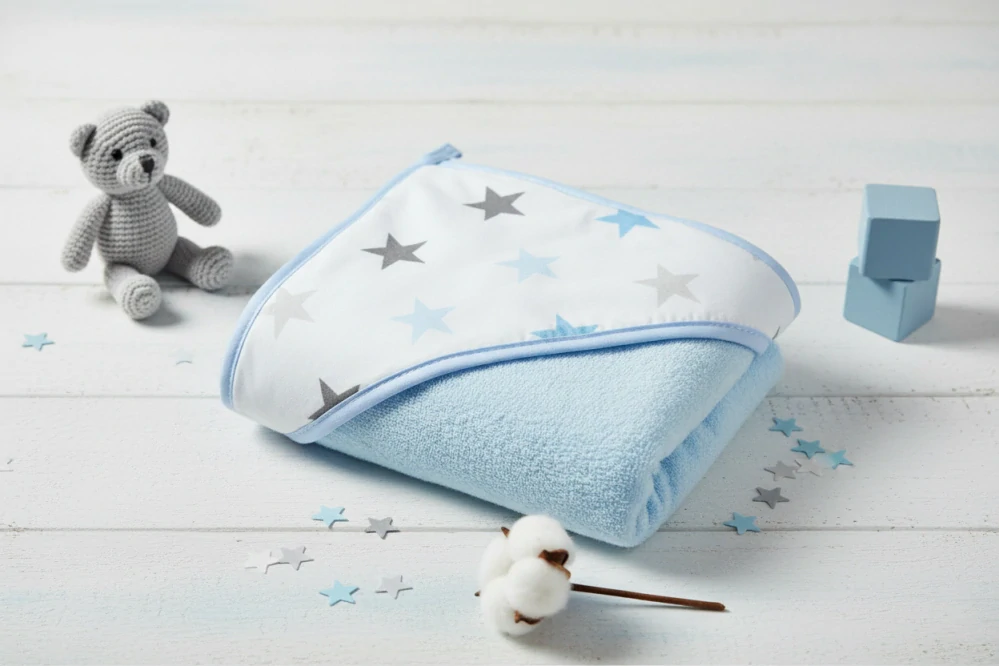 osuška pro miminka má na kapucce - obrázky hvězdiček, celá osuška obšitá.