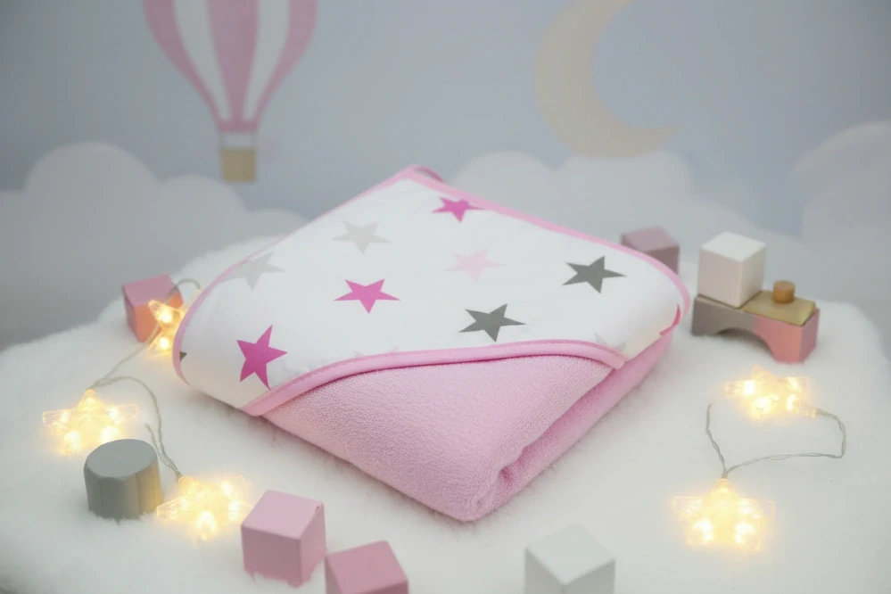 osuška pro miminka má na kapucce - obrázky hvězdiček, celá osuška obšitá.