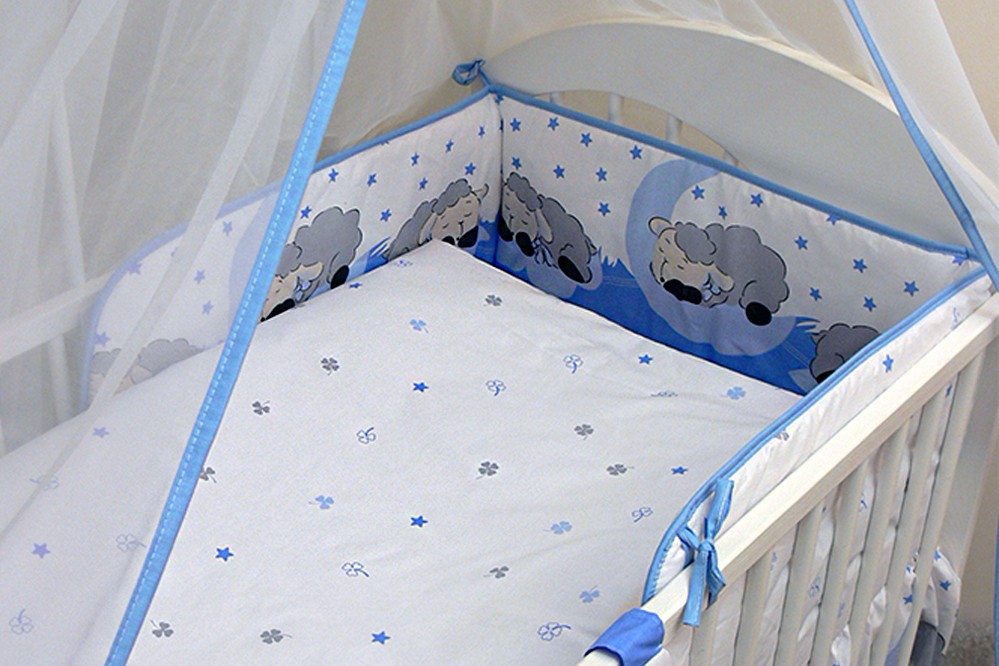 Dětská ložní 3D souprava s mantinelem Veselá ovečka modrá