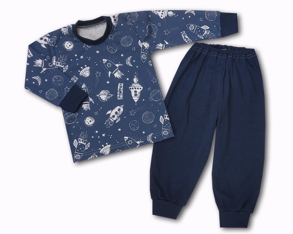 Pyžamo pro děti tvoří pyžamové tričko s dlouhým rukávem a dlouhé pyžamové kalhoty. Pyžamové tričko zdobí vesmírné rakety,rukávky i lem u krku ukončeny elastickými lemy. Dlouhé jednobarevné kalhoty mají pružný pas, nohavičky ukončeny elastickými lemy.