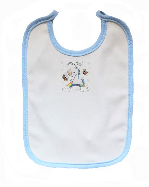 dvojitá bavlna, lemování v modré barvě, obrázek jednorožce s nápisem It's a Boy, na zavazování.