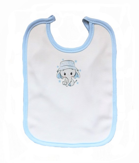 dvojitá bavlna, lemování v modré barvě, obrázek roztomilého sloníka s kloboučkem, na zavazování.