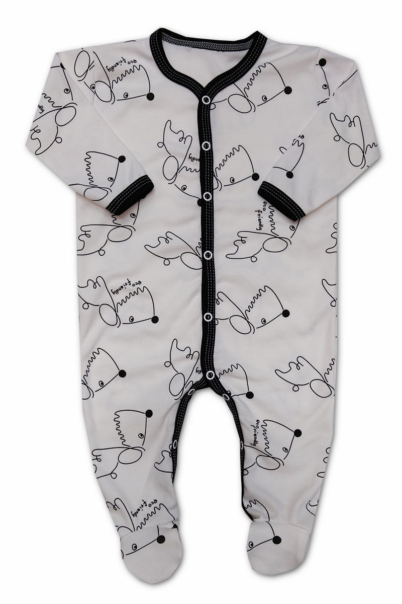 overálek je vyroben z příjemné jemné bavlny s obrázky pejsků, černé lemování, zapínání uprostřed i mezi nožičkami na baby druky - usnadňuje pohodlné oblékání i přebalování novorozených miminek - není nutné přetahovat přes hlavičku.