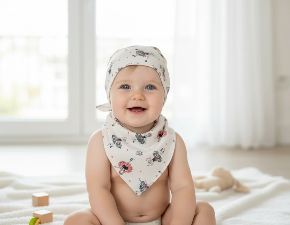 jemný bavlněný šátek má mnoho použití, možné použít jako klasický šáteček na zavazování pod bradičkou, nebo vzadu či jako pirátský, může sloužit i jako slintáček, také jako lehká šálka ochrání krček miminka před chladem.