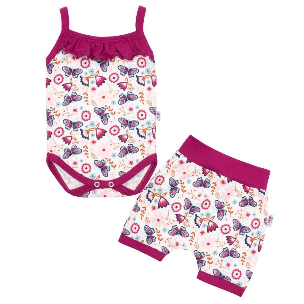 Soupravička obsahuje kraťásky a body na ramínka. Body s krásným motýlkovo květinkovým vzorem s roztomilým volánkem, má praktické zapínání mezi nožičkami na baby druky. Kraťásky mají pohodlný šíroký pružný pas. Ideální oblečení pro miminko pro horké letní dny.