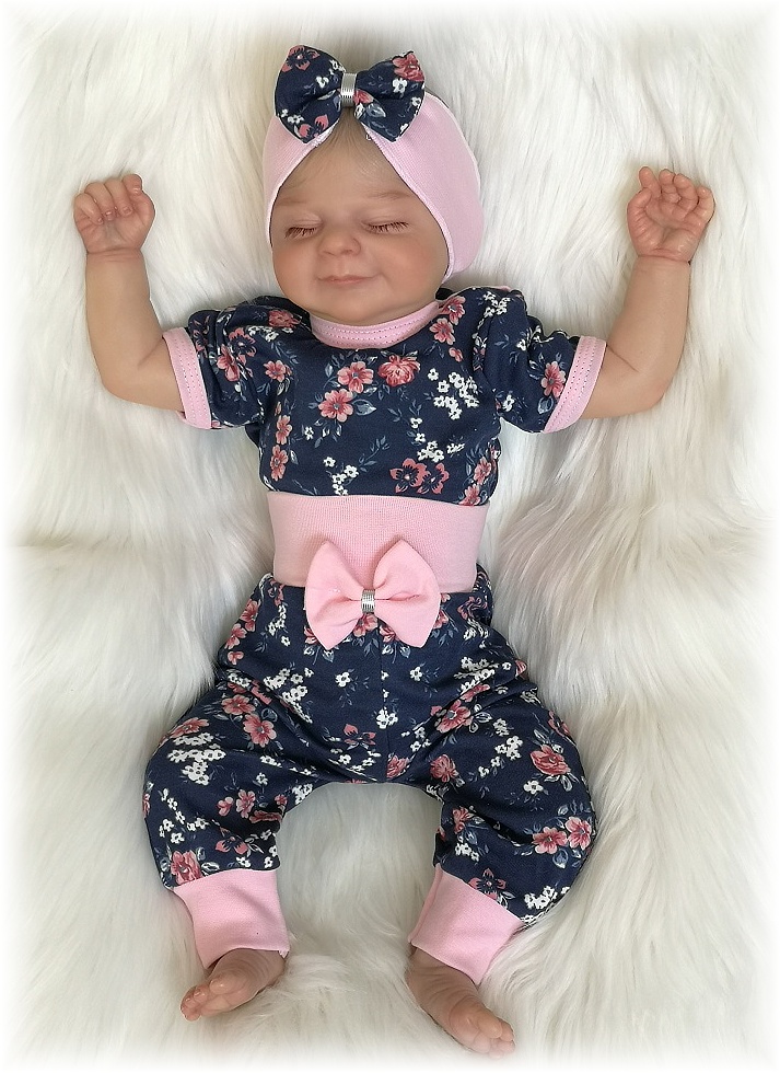 tepláčky pro miminka s mašličkou z kolekce Rose, široký pohodlný pružný pas, nohavice ukončené pružným úpletem, na modrém podkladu potisk růžových a bílých květinek.