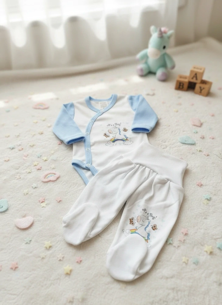 krásné propínací body v bílé barvě s obrázkem jednorožce a nápisem It's a Boy, doplňují polodupačky s pohodlným širokým pasem se stejným obrázkem.