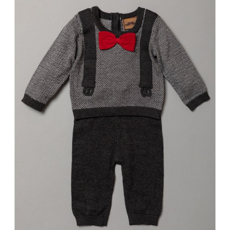 soupravička z bavlněného úpletu obsahuje svetřík s motýlkem a šlemi se zapínáním vzadu na knoflíčky a kalhoty z bavlněného úpletu s pružným pasem.