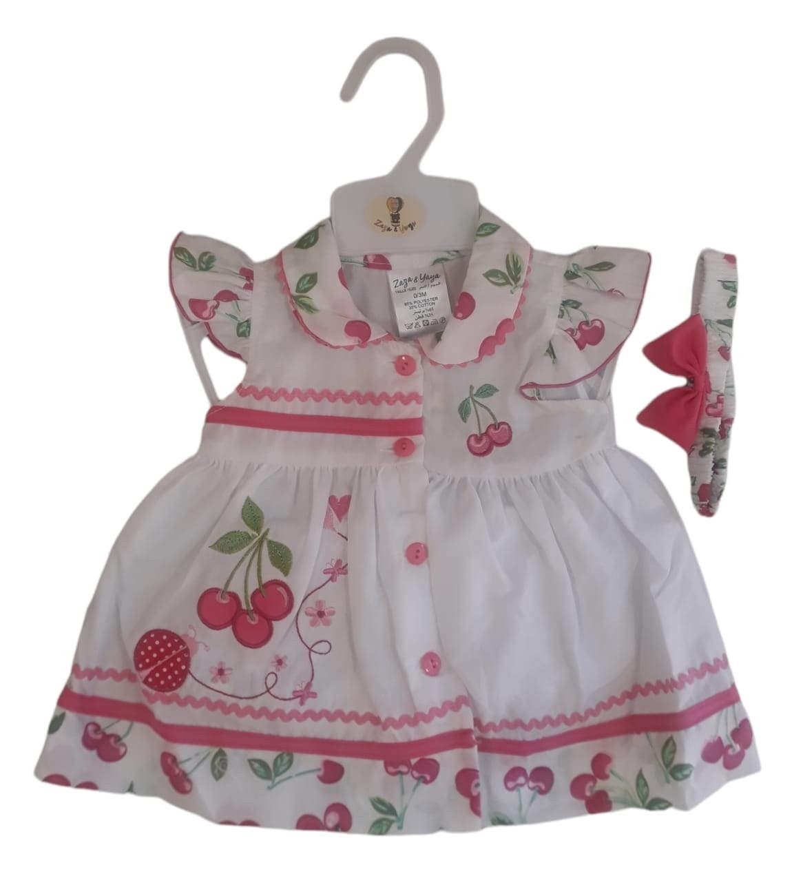 propínací šatičky s čelenkou a kalhotkymi zdobí třešničky, pružná čelenka je zdobená mašličkou, vzdušný lehký materiál. Krásný set pro letní horké dny.