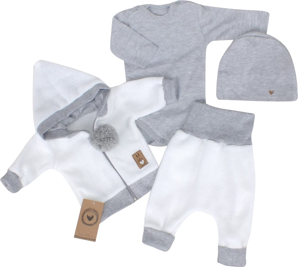soupravička obsahuje 1x body s dlouhým rukávem, svetřík s kapucí se zapínáním na zip , zdobený bambulkou, tepláčky s pružným pasem, nohavičky ukončeny širokýmpružným lemem, čepička se srdíčkem.