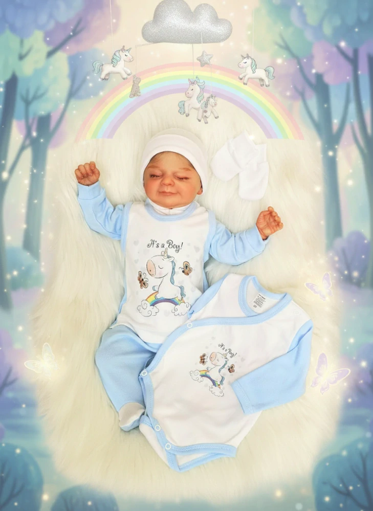 celá soupravička je zdobena obrázky jednorožce s nápisem It's a Boy