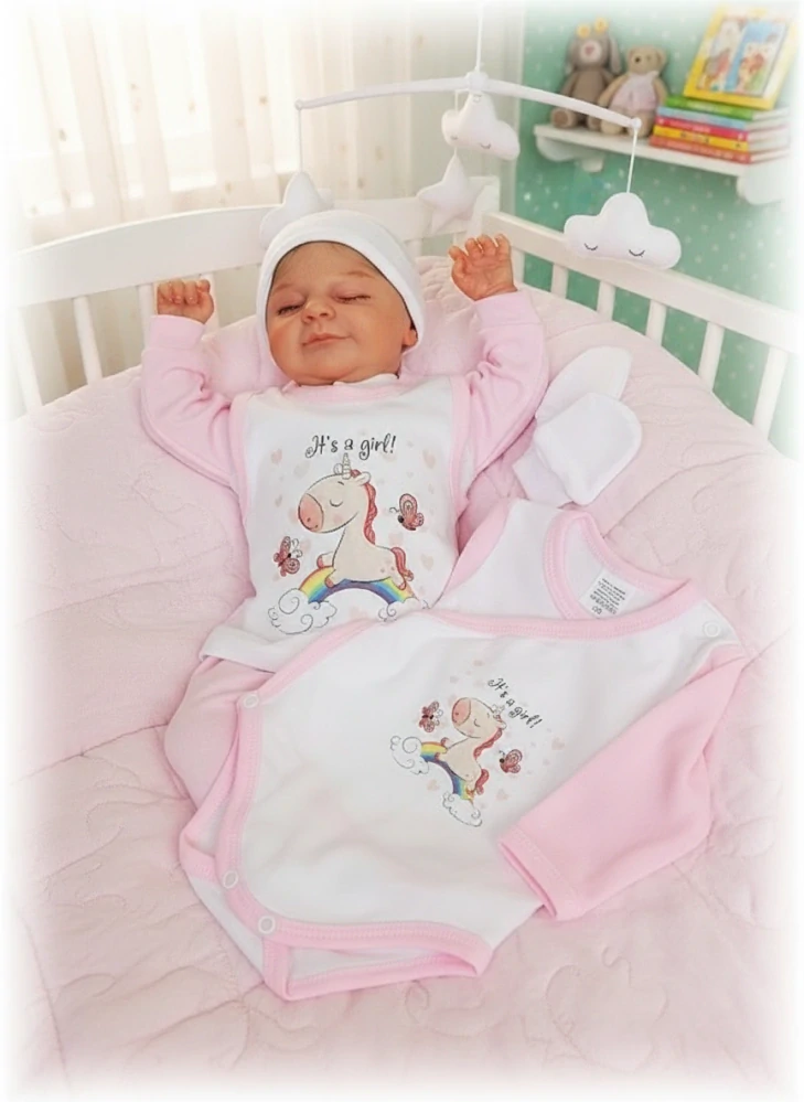 celá soupravička je zdobena obrázky jednorožce s nápisem It's a Girl