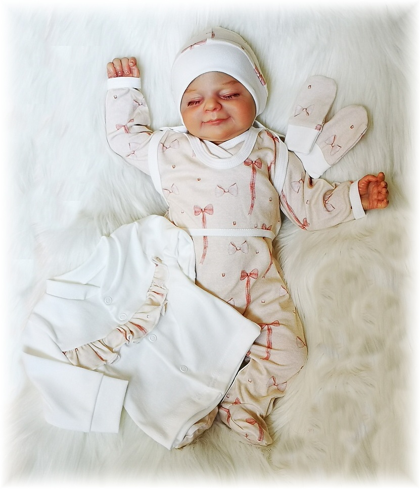 celá soupravička v pudrově růžovém a smetanovém tónu s mašličkami, bílé lemování, kvalitní super jemná bavlna ideální pro novorozené miminko.
