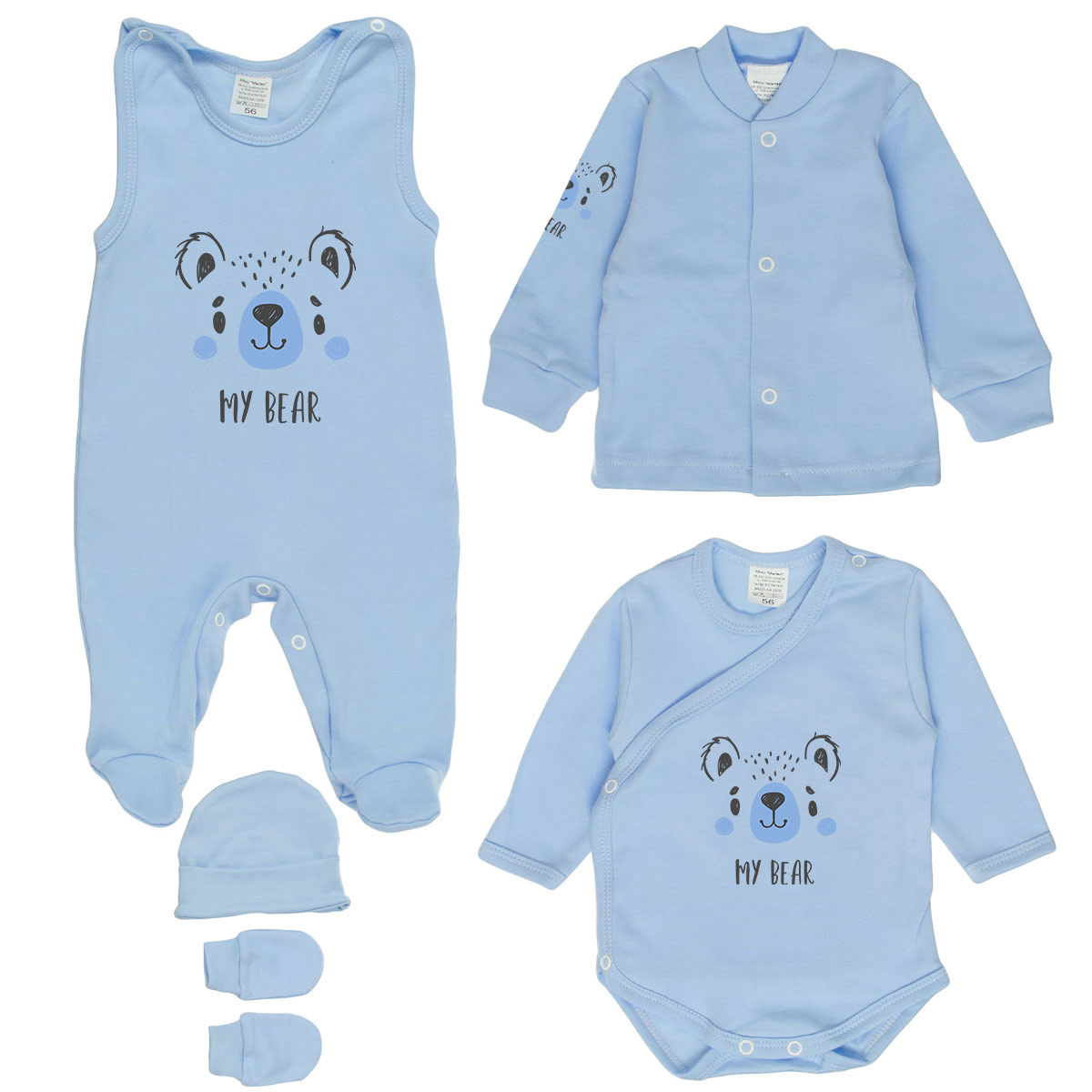 Ideální soupravička do porodnice pro novorozené miminko. Souprava obsahuje 5 oblečků v barvě vhodné pro chlapečky.