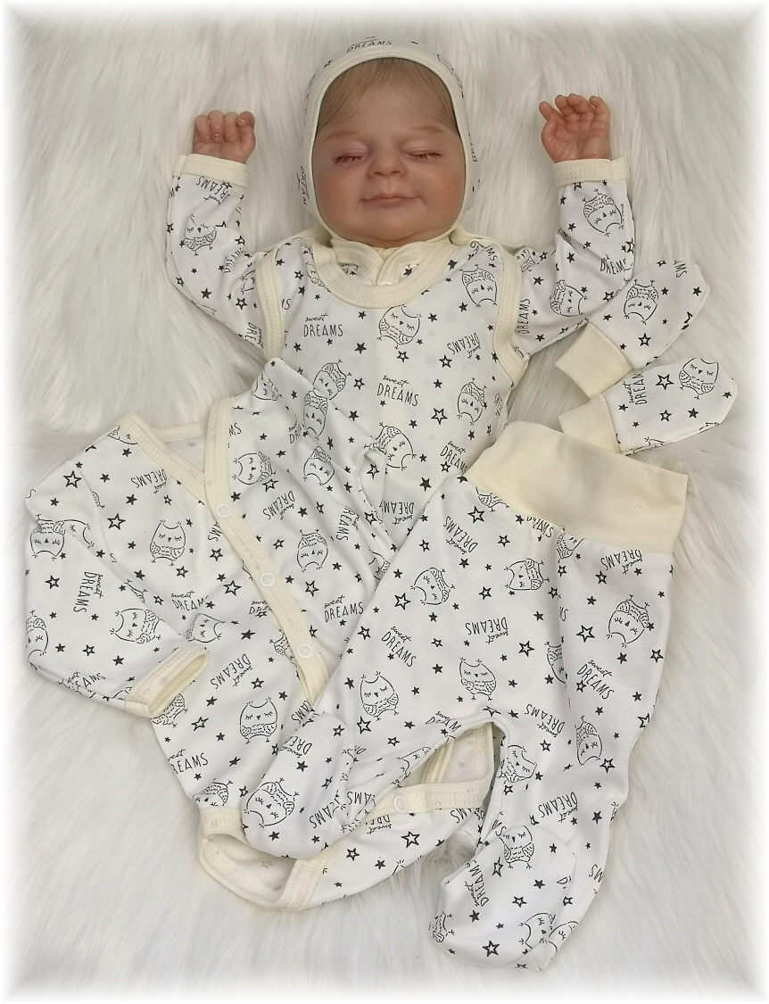 soupravička z kvalitní bavlny ideální pro miminka v krémové barvě s potiskem sladkých soviček.
