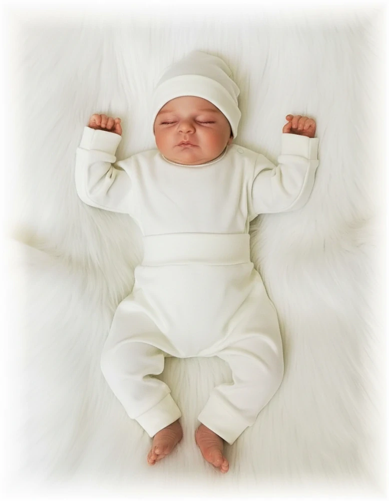 soupravička obsahuje body se zapínání na ramínku i mezi nožičkami na baby druky, tepláčky s širokým pružným pasem. Čepička není součástí.