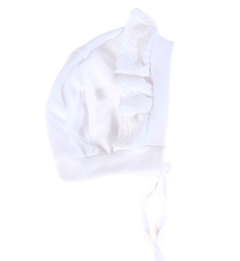 Bílá bavlněná čepička na zavazování lemovaná bavlněnou krajkou.
