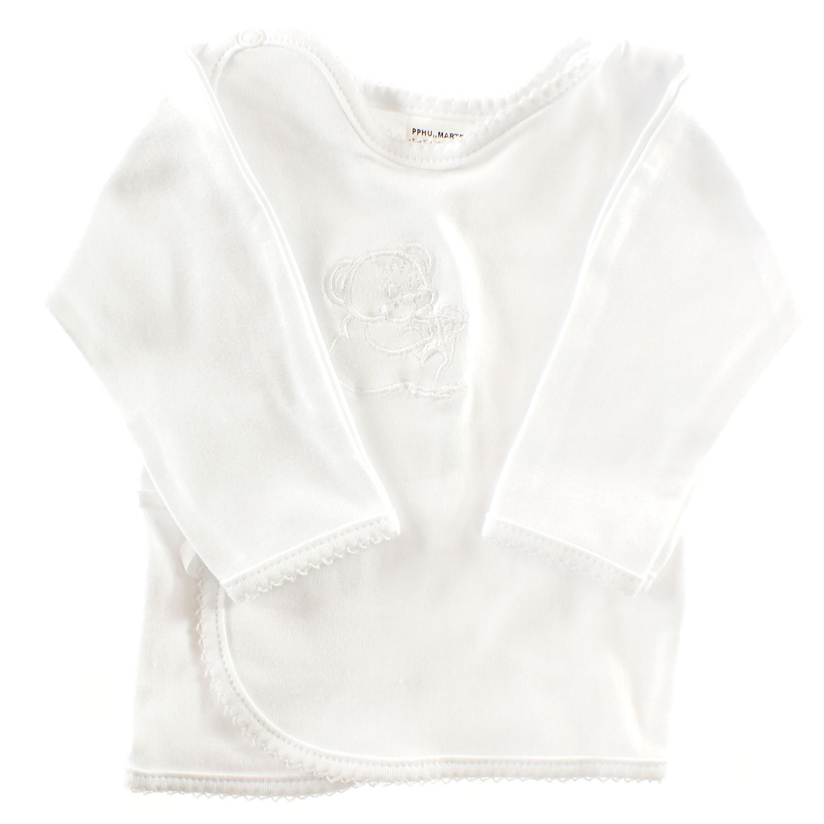sněhobílá košilka s výšivkou medvídka a ozdobným lemováním, na ramínku zapínání na baby druk, na boku zavazování na stužku. Dvojitá látka na předním díle výborně ochrání citlivé bříško miminka.