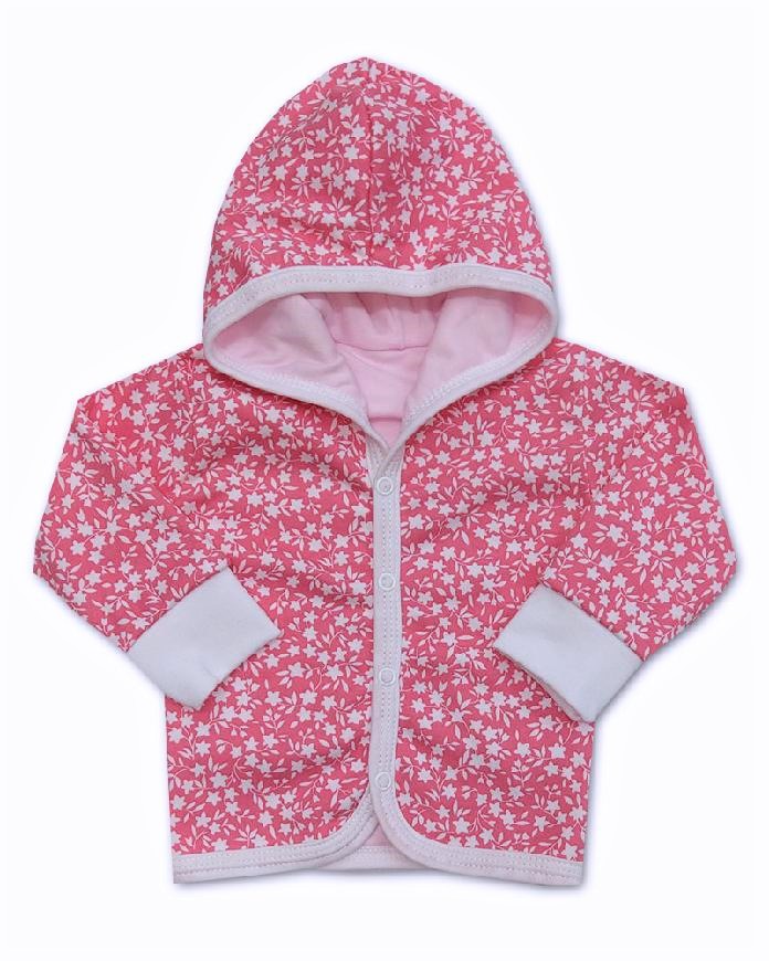 mikinka z dvojité bavlny svrchní vzor bílý kvítek , vnitřní růžová 100% bavlna. Zapínání na baby druky, růkávky ukončené pružným lemem.
