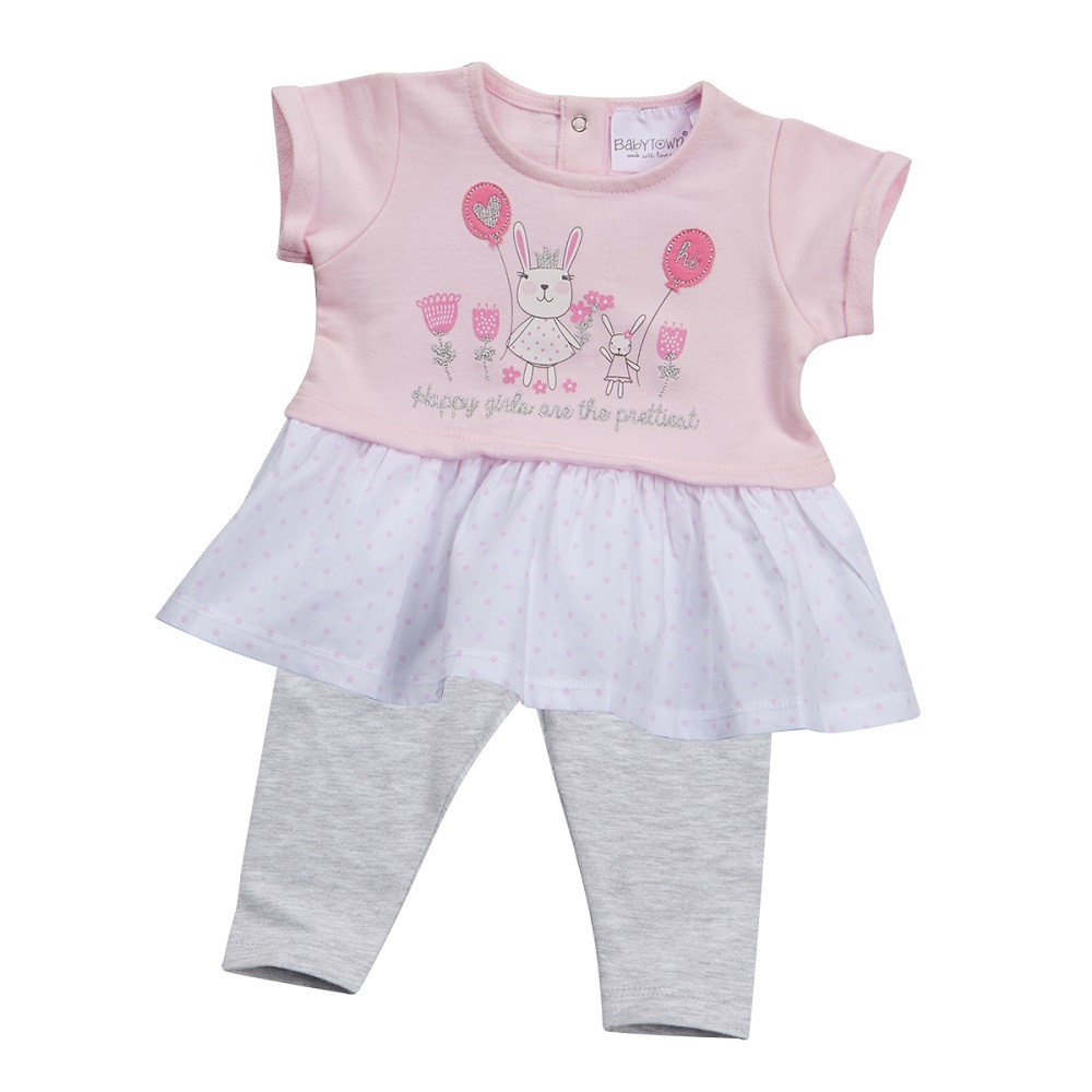 bavlněná tunika s obrázkem a puntíkovaným kanýrkem, pro pohodlné oblékání přes hlavičku zapínání vzadu na baby druky, tuniku doplňují šedé legíny .