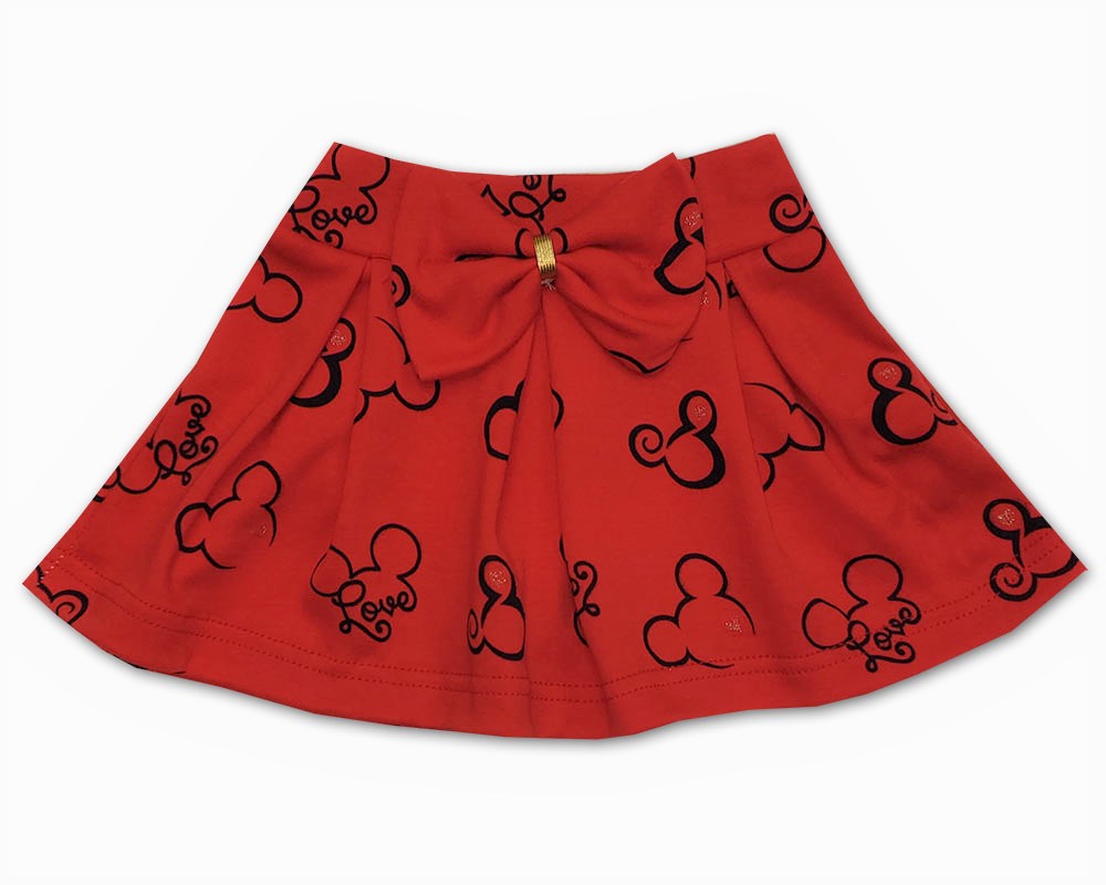 nařasená sukýnka pro holčičky zdobená mašličkou, potisk hlaviček myšek s nápisem LOVE.