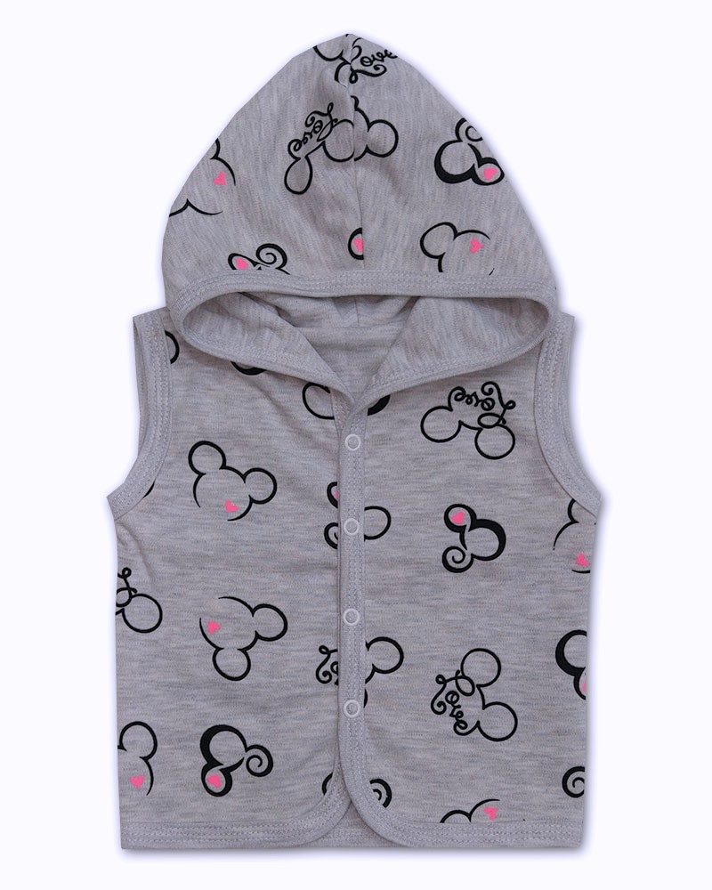 jemný bavlněný materiál s obrázky hlaviček myšky a nápisem LOVE podšitý bavlnou v šedé melanž barvě, zapínání vestičky uprostřed na baby druky.
