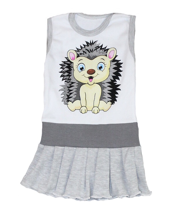 letní šatičky bez rukávků, nabíraná sukýnka, na předním díle roztomilý Ježeček. Pro pohodlné oblékání mají šatičky pro holčičky zapínání na ramínku na baby druk.
