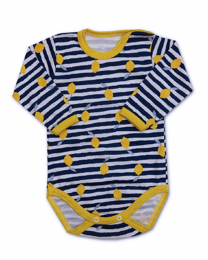 pruhované body s dlouhým rukávkem s obrázky citrónků, pro pohodlné oblékání i přebalování zapínání na ramínku a mezi nožičkama na baby druky.