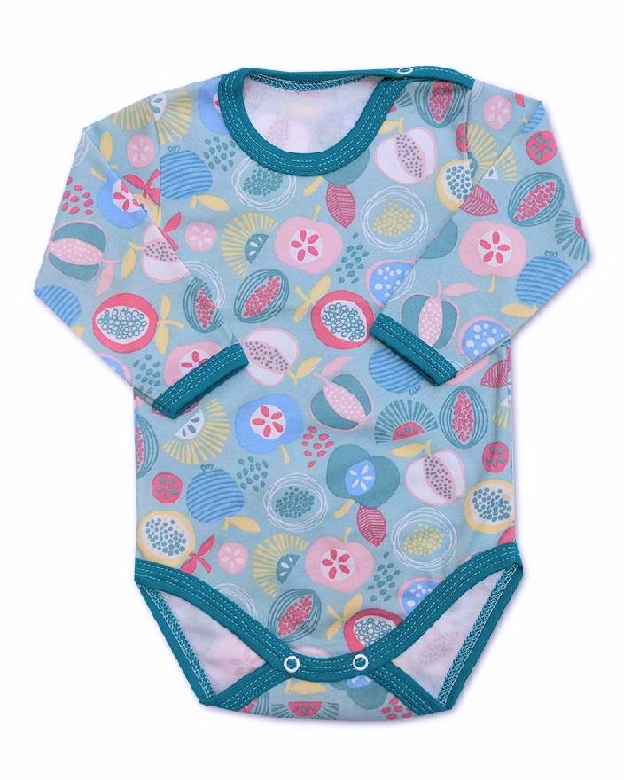 body s dlouhým rukávkem s letním motivem ovoce, pro pohodlné oblékání i přebalování zapínání na ramínku a mezi nožičkama na baby druky.