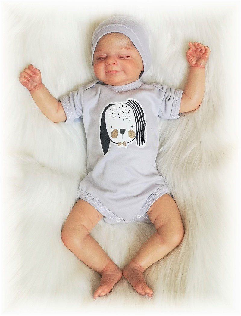 šedé bodynko s krásným velkým obrázkem pejska , pro pohodlné oblékání přes hlavičku zapínání na obou ramínkách na baby druky.