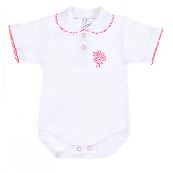 bílé body s výšivkou květinky , kulatým límečkem s ozdobným růžovám lemováním, zapínání u krku a mezi nožičkami na baby druky, vhodné pro slavnostnější příležitost v letní dny.
