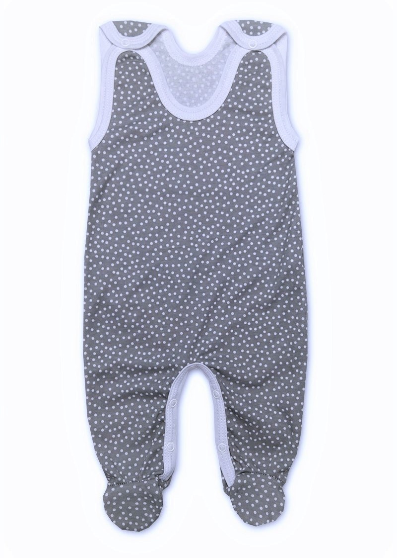 dupačky jsou vyrobeny z příjemné jemné bavlny, zapínání na ramínkách a mezi nožičkami na baby druky - usnadňuje pohodlné oblékání i přebalování miminek. Dupačky v příjemné šedé barvě s bílými puntíky a lemováním..