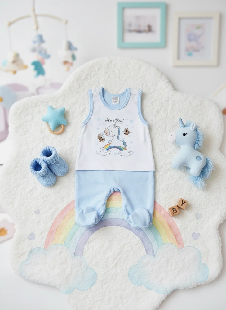 bavlněné dupačky s roztomilým jednorožcem a nápisem It's a Boy, zapínání na ramínkách i mezi nožičkami na baby druky.