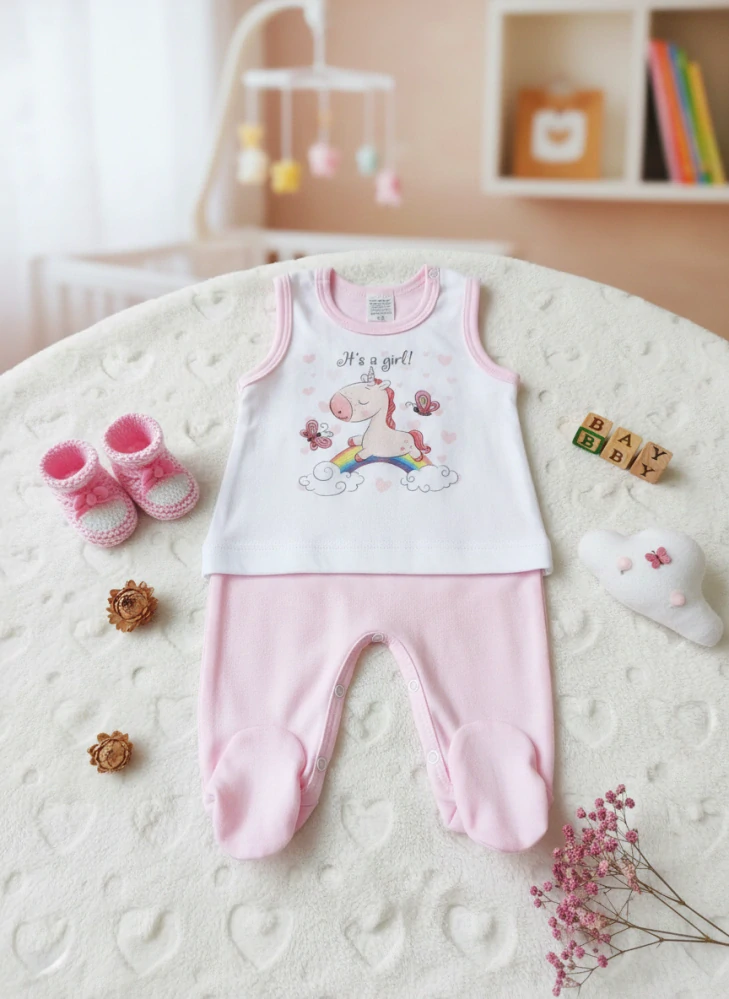 bavlněné dupačky s roztomilým jednorožcem a nápisem It's a Girl, zapínání na ramínkách i mezi nožičkami na baby druky.