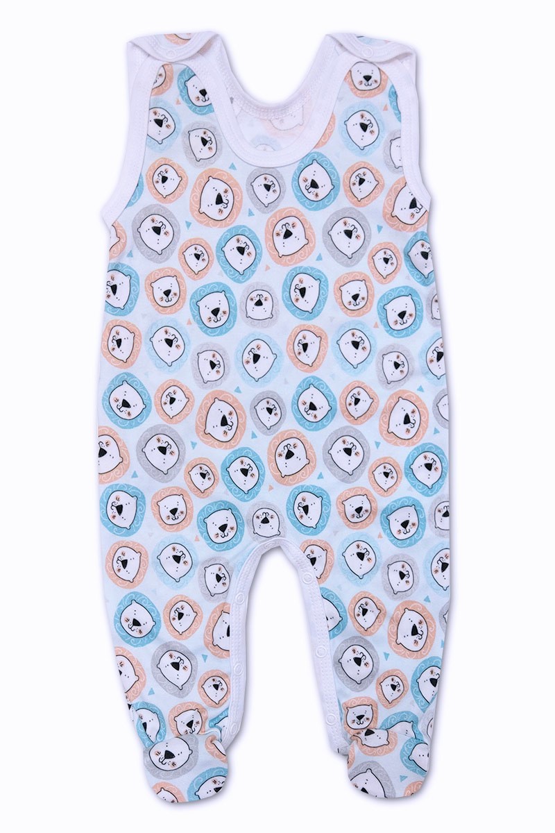 dupačky jsou vyrobeny z příjemné super jemné bavlny, zapínání na ramínkách a mezi nožičkami na baby druky - usnadňuje pohodlné oblékání i přebalování miminek. Dupačky se vzorem hlaviček lvíčků, bílé lemování.