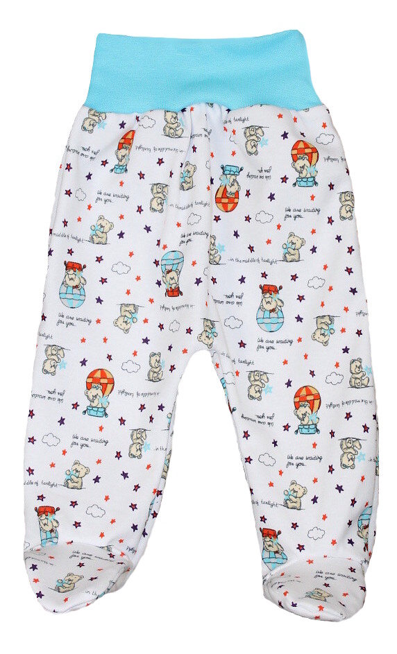 bavlněné polodupačky s obrázky medvídků v balónu , široký pohodlný pružný pas v tyrkysové barvě.