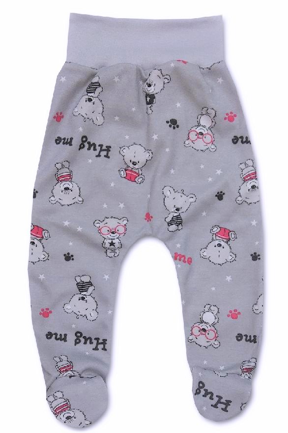 bavlněné polodupačky s roztomilými medvídky na šedém podkladu, široký pohodlný pružný pas v šedé barvě, netlačí na bříško dítěte.