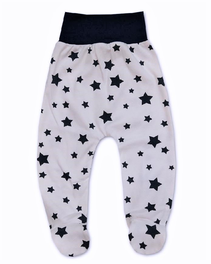 bavlněné polodupačky s tmavě modrými hvězdičkami na bílém podkladu, široký pohodlný pružný pas v modré barvě, netlačí na bříško dítěte.