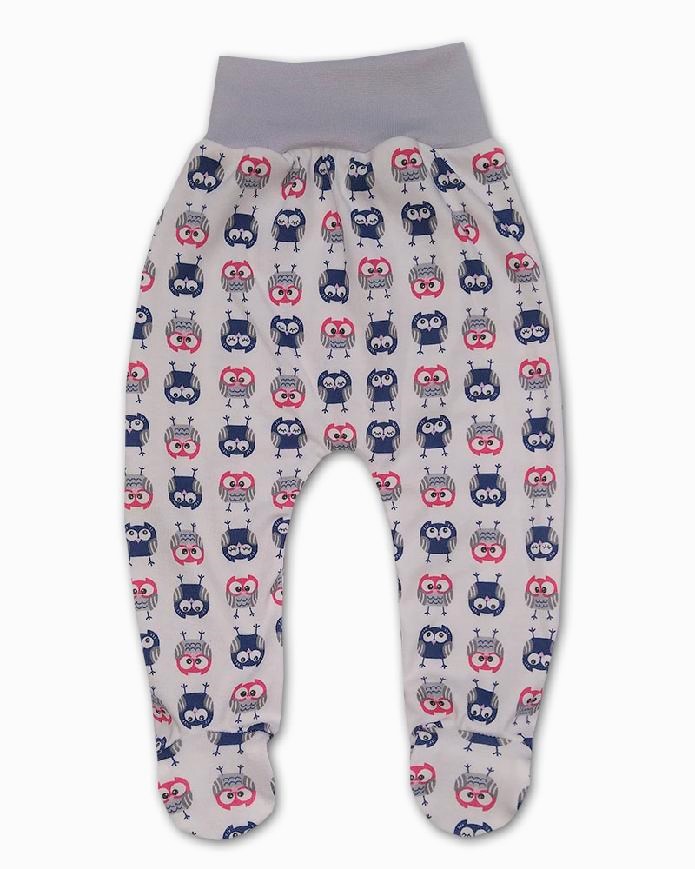 bavlněné polodupačky se sovičkami na smetanovémpodkladu, široký pohodlný pružný pas v šedé barvě, netlačí na bříško dítěte.