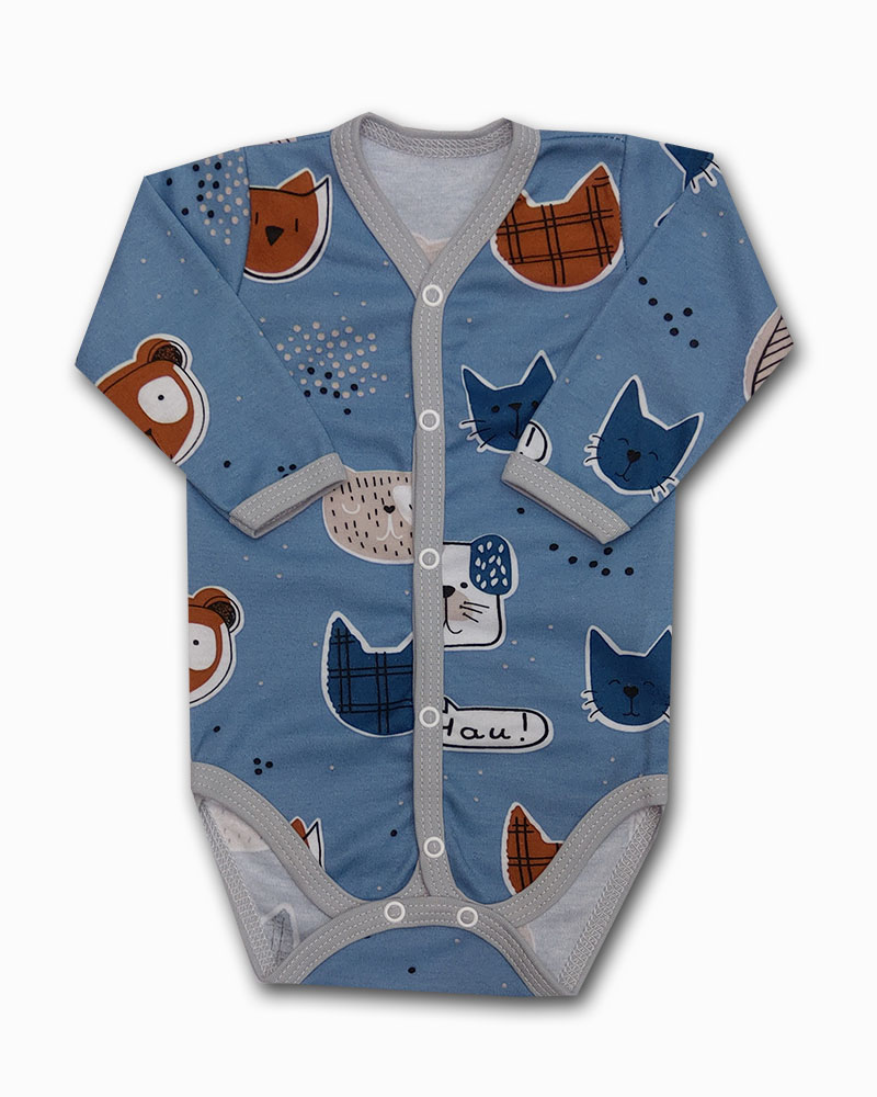 bobynko je vyrobené z příjemné jemné bavlny, zapínání uprostřed na baby druky - usnadňuje pohodlné oblékání i přebalování novorozených miminek - není nutné přetahovat přes hlavičku. Body s obrázky hlaviček zvířátek, šedé lemování.