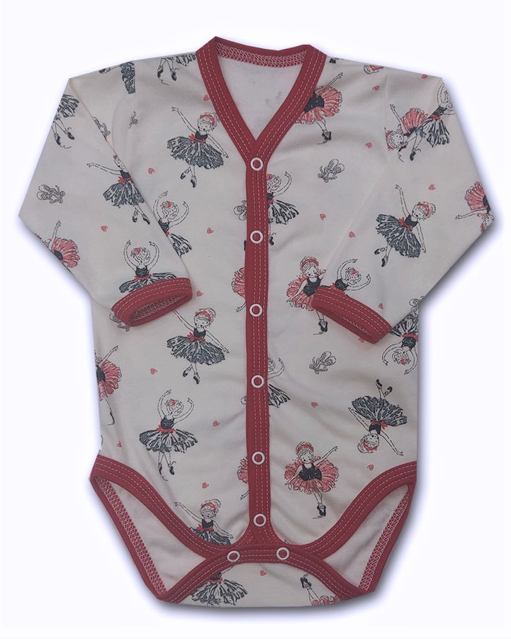 bodynko je vyrobené z příjemné jemné bavlny, zapínání uprostřed na baby druky - usnadňuje pohodlné oblékání i přebalování novorozených miminek - není nutné přetahovat přes hlavičku. Body s obrázky baletek, červené lemování.