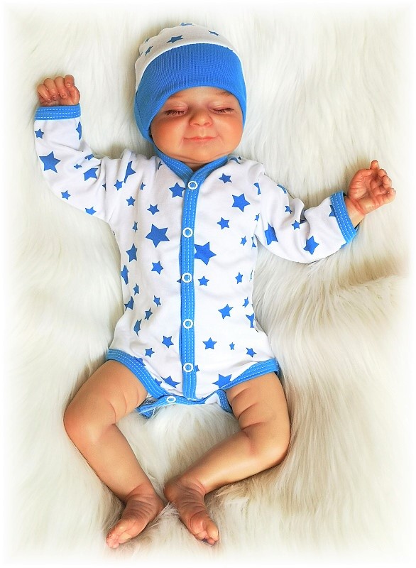 bobynko je vyrobené z příjemné jemné bavlny, zapínání uprostřed na baby druky - usnadňuje pohodlné oblékání i přebalování novorozených miminek - není nutné přetahovat přes hlavičku. Body s modrými hvězdičkami na bílém podkladu, modré lemování.