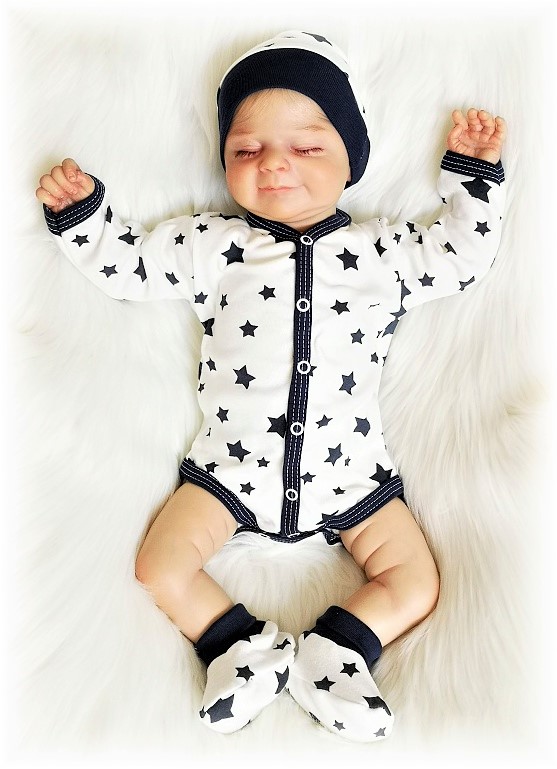 bobynko je vyrobené z příjemné jemné bavlny, zapínání uprostřed na baby druky - usnadňuje pohodlné oblékání i přebalování novorozených miminek - není nutné přetahovat přes hlavičku. Body s tvamodrými hvězdičkami na bílém podkladu,modré lemování.