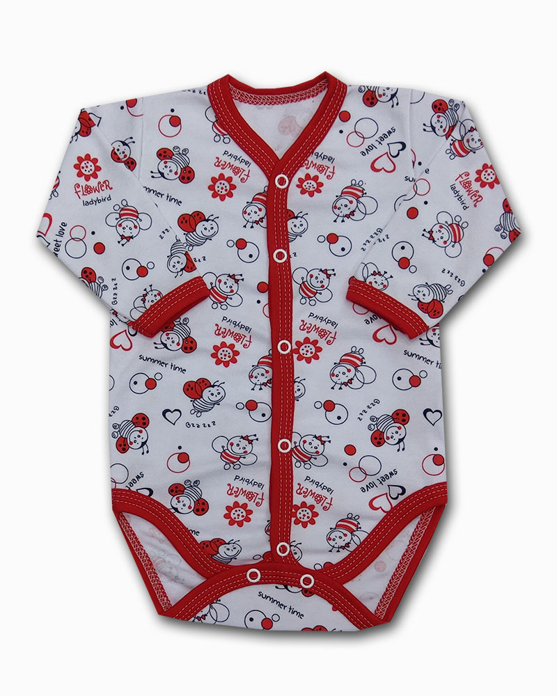 bodynko je vyrobené z příjemné jemné bavlny, zapínání uprostřed na baby druky - usnadňuje pohodlné oblékání i přebalování novorozených miminek - není nutné přetahovat přes hlavičku. Body s obrázky berušek, červené lemování.