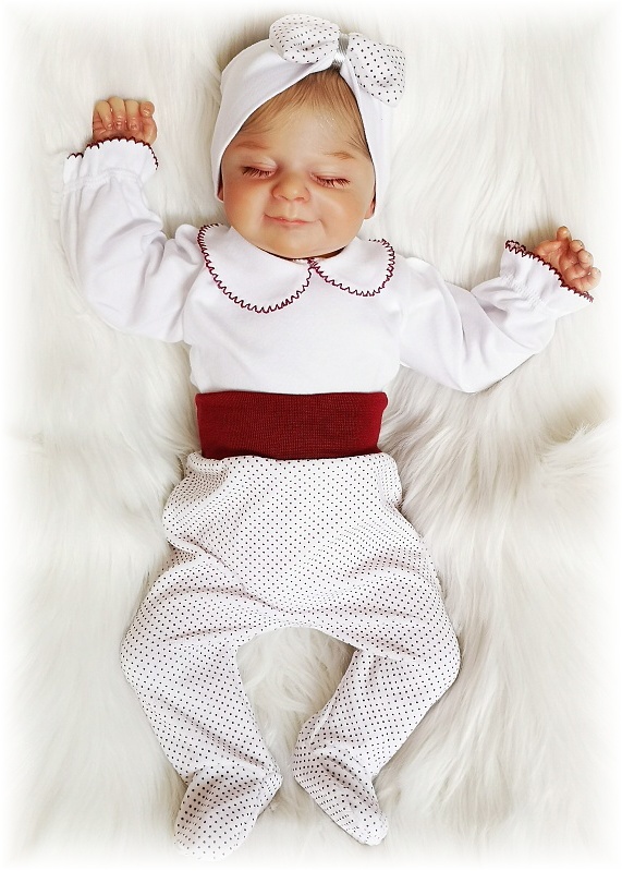sametové polodupačky s bordó puntíčkyna bílém podkladu, široký pohodlný pružný pas v bordó barvě, netlačí na citlivé bříško dítěte.