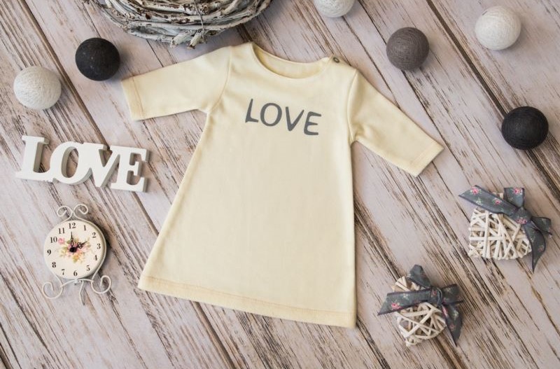 šatičky díky své jednoduchosti a jemnosti působí dojmem radostné lehkosti, jsou vyrobeny ze 100% bavlny, která zaručuje nejvyšší komfort nošení. Na předním díle nápis LOVE, na ramínku zapínání na baby druk, pro snadné oblékání přes hlavičku.
