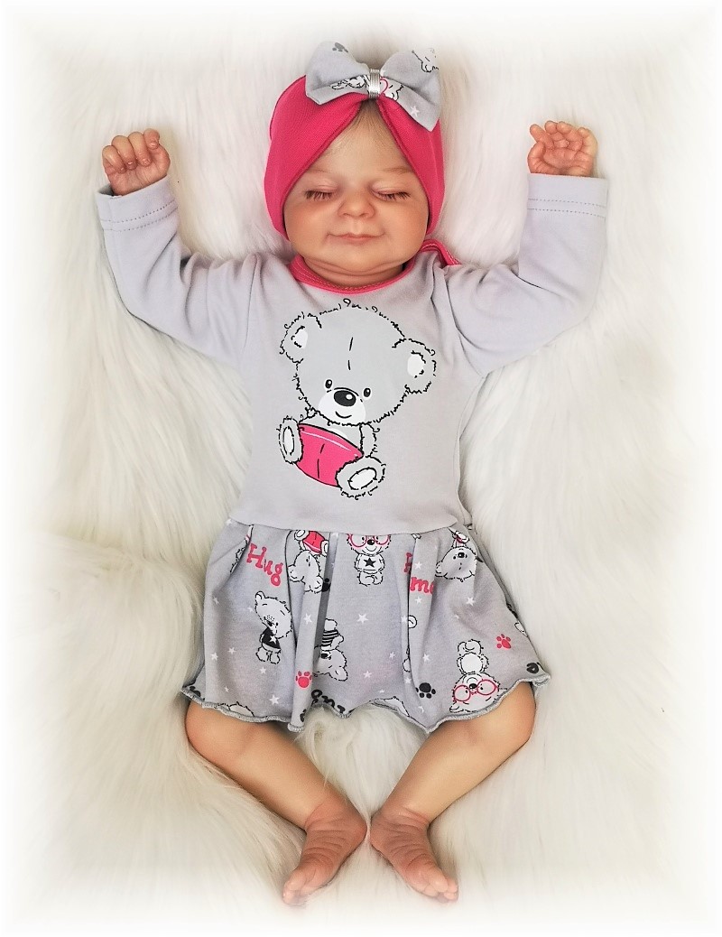 body s dlouhým rukávkem, sukýnkou, na předním díle roztomilý obrázek medvídka. Zachovává výhodu bodynka, krásně drží plenku, pohodlné oblékání i přebalování. Zapínání na ramínku i mezi nožičkami na baby druky.